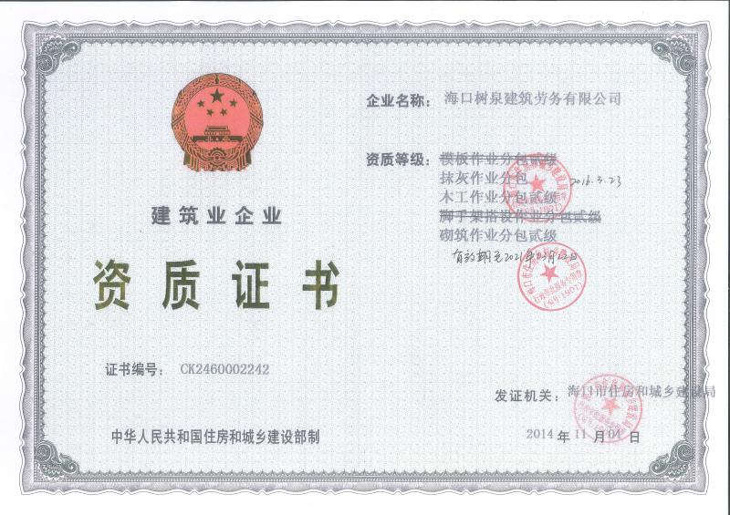 海口樹泉建筑勞務(wù)有限公司成立于2011年,公司位于海口,其前身是一家專業(yè)建筑施工隊,自2004年即開始在海南從事建筑勞務(wù)施工。自成立至今,公司已經(jīng)擁有一支科學(xué)管理、質(zhì)量過硬、能打硬仗,搶工期的專業(yè)隊伍。能獨立承擔(dān)大中型工業(yè)與民用建筑 、室內(nèi)外裝修、各類機電設(shè)備安裝工程。代表工程有海口濱海華庭、三亞時代海岸T01/02/04/05棟高層、合肥東海花園二期、陵水富力灣B區(qū)高層、三亞金中海(酒店)、瓊海大印經(jīng)典花園、海口環(huán)球海景大酒店(四星級酒店,在建中)、陵水珍珠大廈(五星酒店)、海口萬達(dá)廣場、美蘭機場二期。
